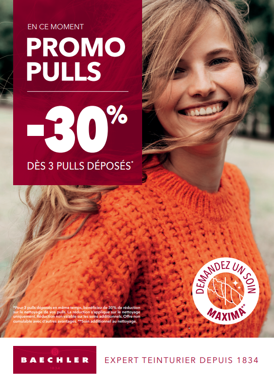 Conditions : Pour 3 pulls déposés en même temps, bénéficiez de 30% de réduction sur le nettoyage de vos pulls. La réduction s’applique sur le nettoyage uniquement. Réduction non valable sur les soins additionnels. Offre non cumulable avec d’autres avantages.