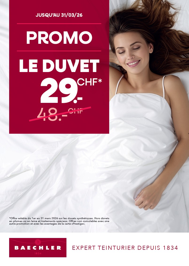 *Offre valable jusqu’au 31 mars 2026 sur les duvets synthétiques. Hors duvets en plumes ou en laine et traitements spéciaux. Offre non cumulable avec une autre promotion et avec les avantages de la carte « PRESTIGE».